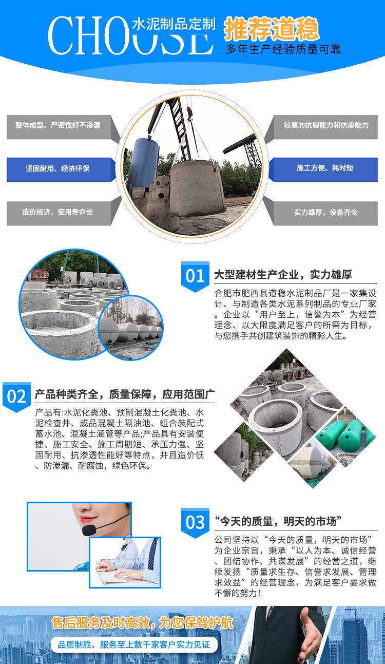 合肥市肥西縣道穩水泥制品廠是一家集設計、與制造各類水泥系列制品的專業廠家。產品有:水泥化糞池、預制混凝土化糞池、水泥檢查井、成品混凝土隔油池、組合裝配式蓄水池、混凝土涵管等產品;產品具有安裝便捷、施工安全、施工周期短、承壓力強、堅固耐用、抗滲透性能好等特點,并且造價低、防滲漏、耐腐蝕,綠色環保,是混凝土制品在建筑工程應用中的重大技術創新,深受廣大房地產商和建筑工程公司客戶青睞。